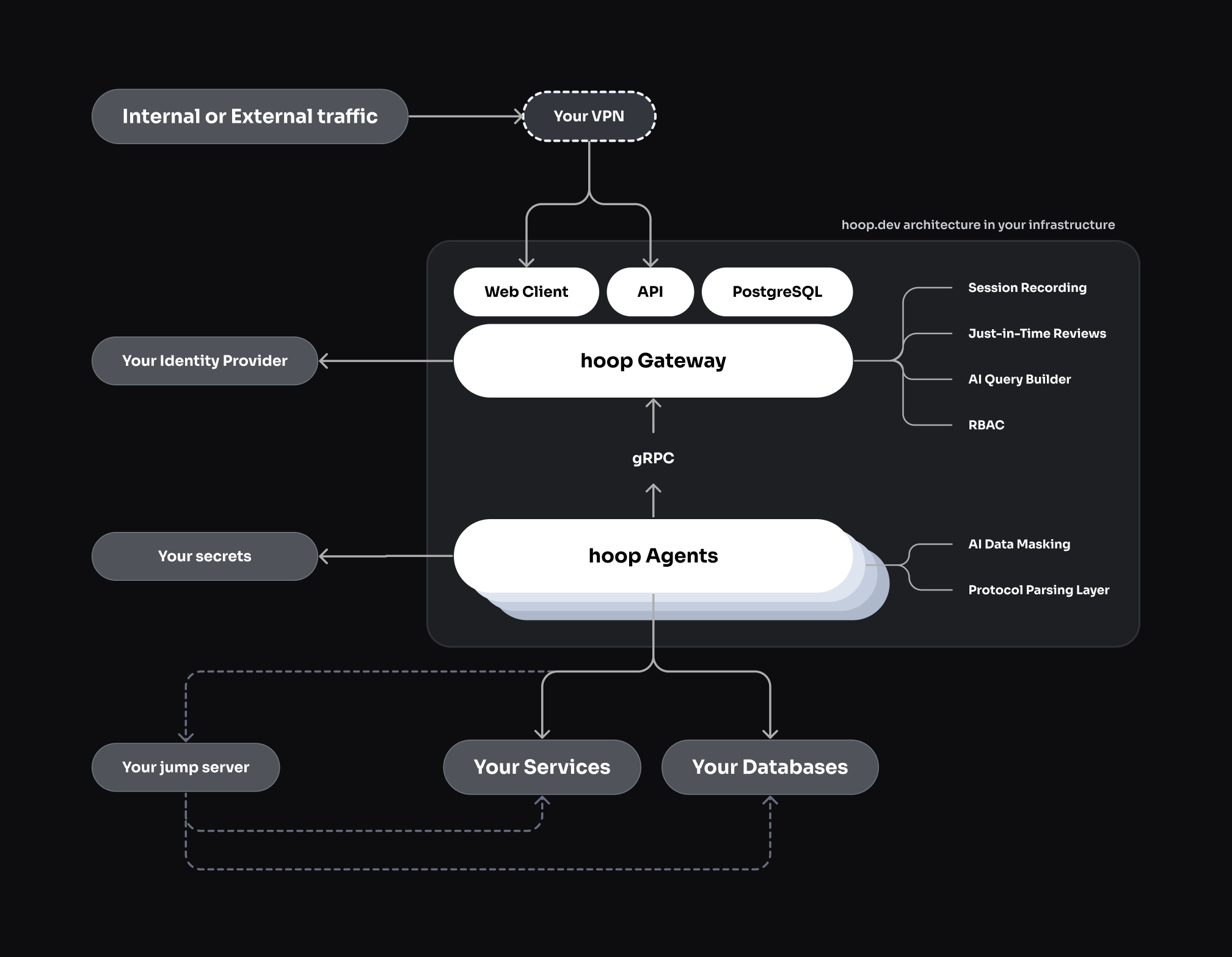 - hoop Agent: A lightweight agent that runs in your infrastructure and executes the operations you request. hoop.dev’s agent is responsible for running the operations in your infrastructure through a secure gRPC tunnel with the hoop Gateway;